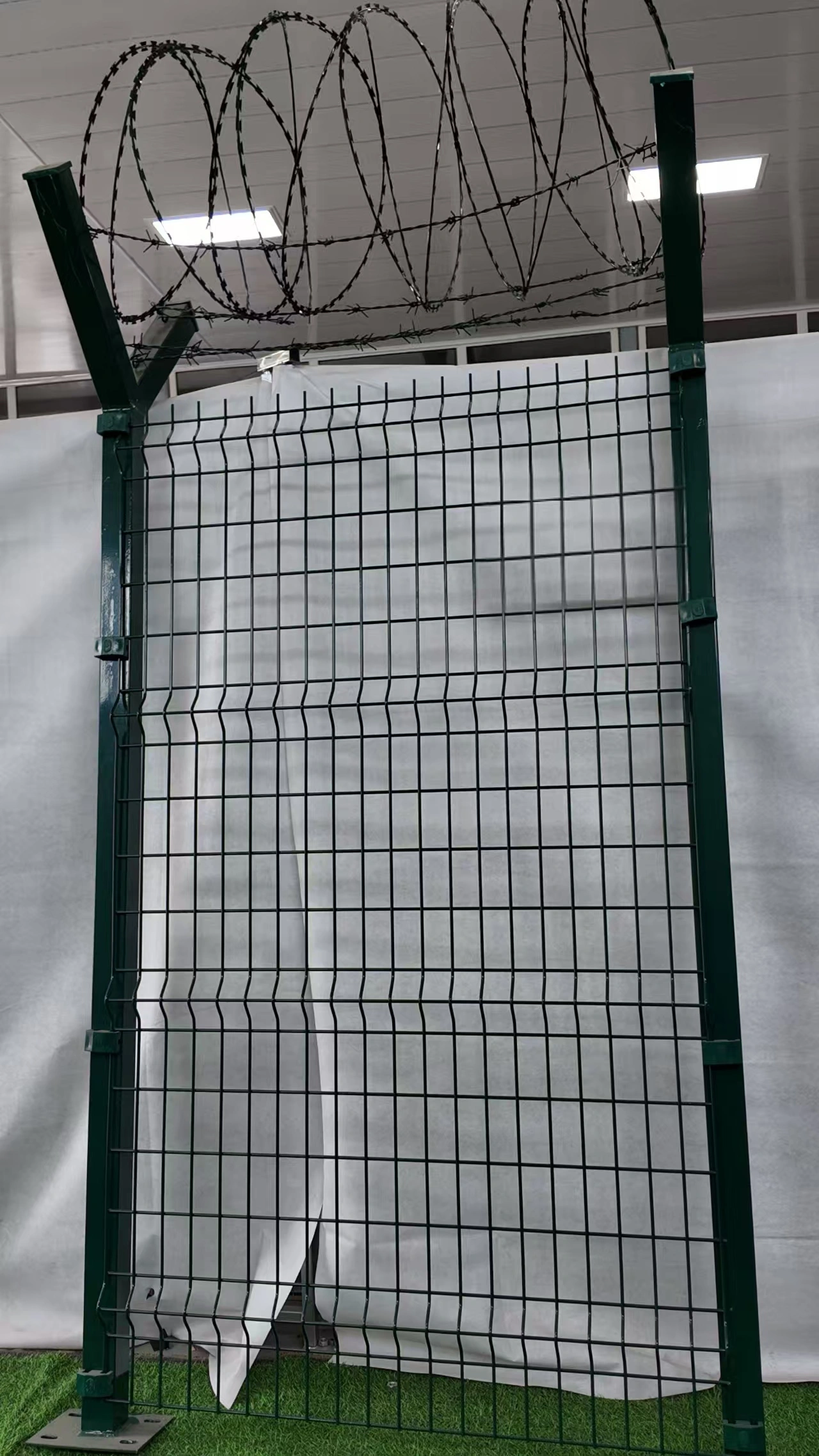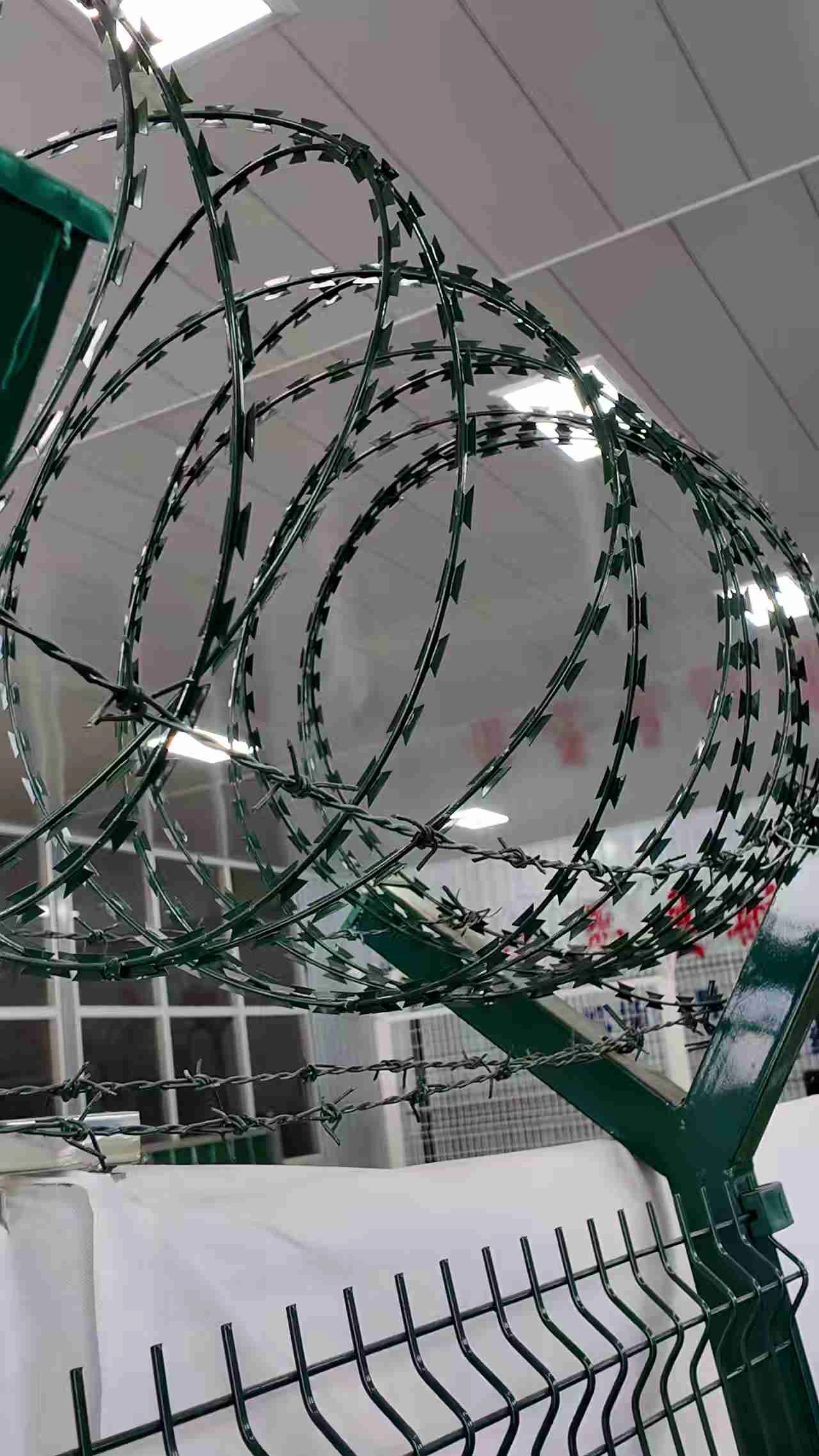 - Structure: The main body of the fence is made of high-strength steel wires that are welded together to form a sturdy diamond or square grid. On top of this, razor wire with sharp blades is welded to the mesh. The blades are densely arranged along the edges, forming a powerful protective barrier.